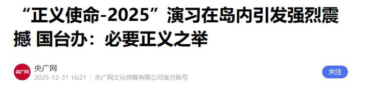2.《“正义责任-2025”演习在岛内激发利弊漂泊 国台办:必要正义之举》 2025-12-31 16:21 | 起原:央广网